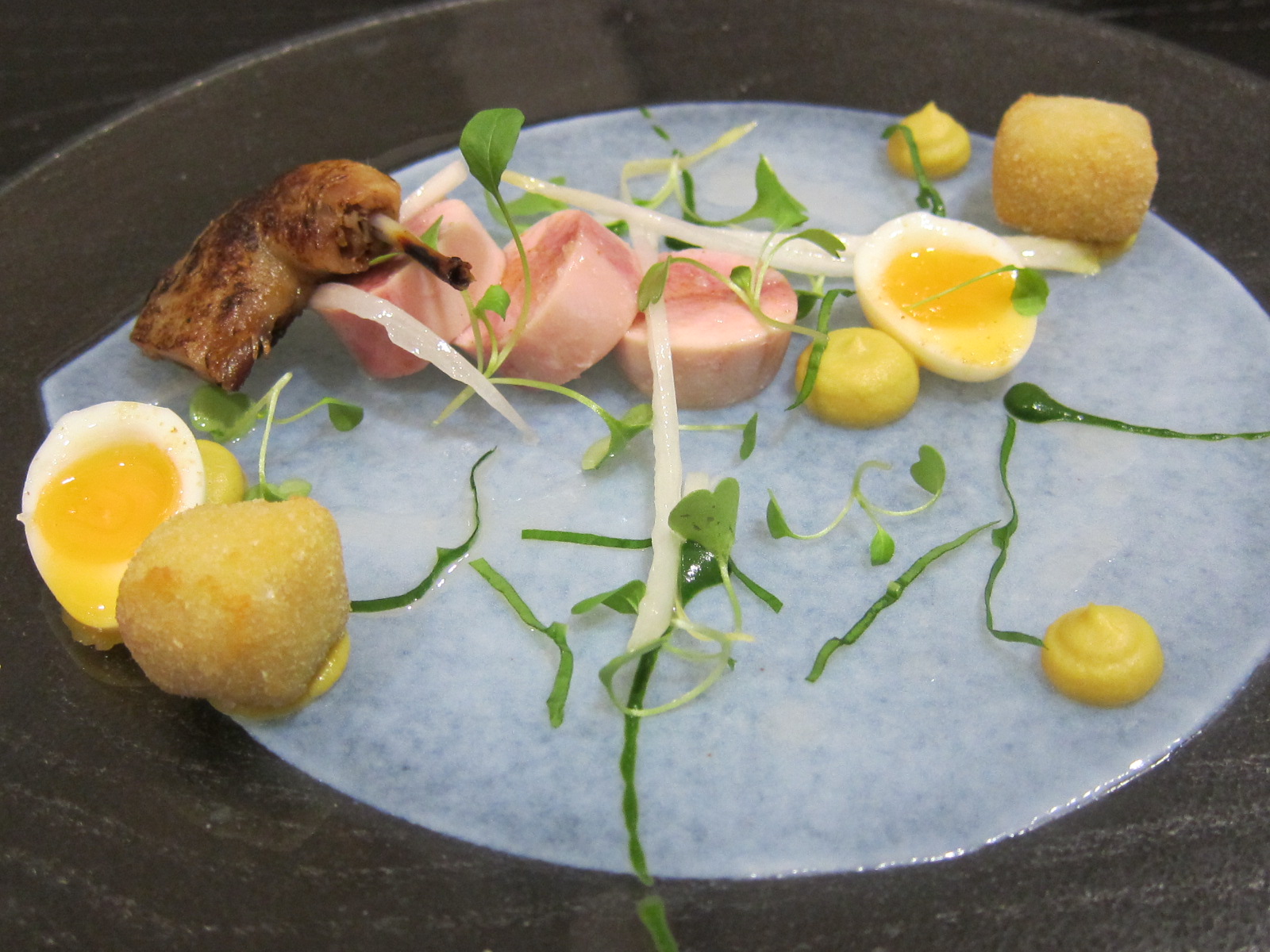The ballotine of quail, of course, propping up the pan fried leg. Quails egg, some gorgeous crunchy pigs trotter nuggets, bang in season wild garlic, sweetcorn and garlic puree.